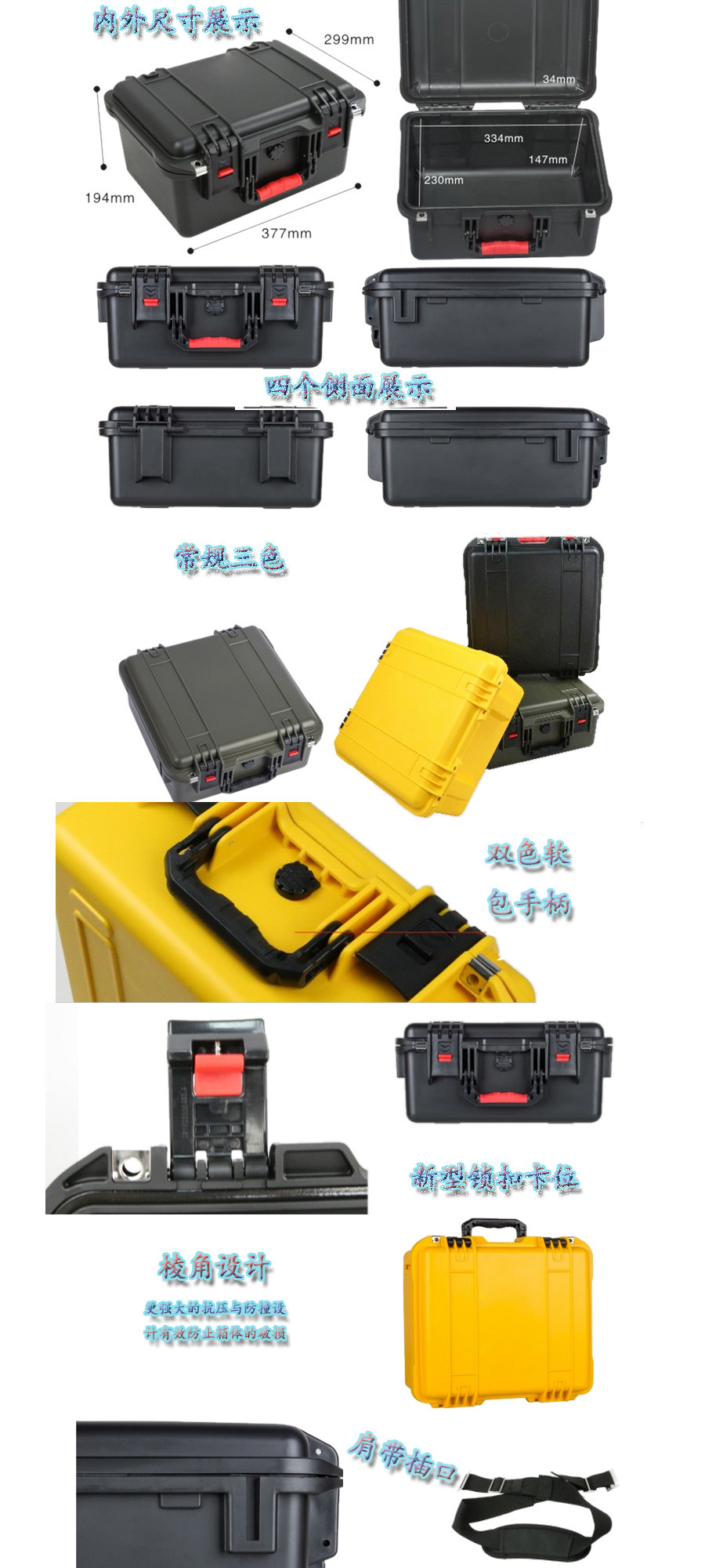 簡(jiǎn)要說明:廣泛用于傳媒、公安、消防、軍隊(duì)、航空、戶外攝影、野外考察、科學(xué)探測(cè)等眾多領(lǐng)域的高端儀器、儀表。具有高強(qiáng)度、高抗壓沖擊、防潮、絕對(duì)密封、防塵、防水等特點(diǎn)。產(chǎn)品材質(zhì):ABS原料,箱體采用高抗沖擊的高分子聚合材料一體注塑成型,密封采用扁型彈性發(fā)泡密封橡膠條,確保防水氣密,所有較軸均采用不銹鋼材質(zhì)。