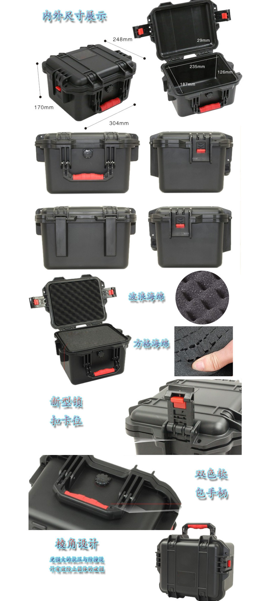 簡(jiǎn)要說明:廣泛用于傳媒、公安、消防、軍隊(duì)、航空、戶外攝影、野外考察、科學(xué)探測(cè)等眾多領(lǐng)域的高端儀器、儀表。具有高強(qiáng)度、高抗壓沖擊、防潮、絕對(duì)密封、防塵、防水等特點(diǎn)。產(chǎn)品材質(zhì):ABS原料,箱體采用高抗沖擊的高分子聚合材料一體注塑成型,密封采用扁型彈性發(fā)泡密封橡膠條,確保防水氣密,所有較軸均采用不銹鋼材質(zhì)。