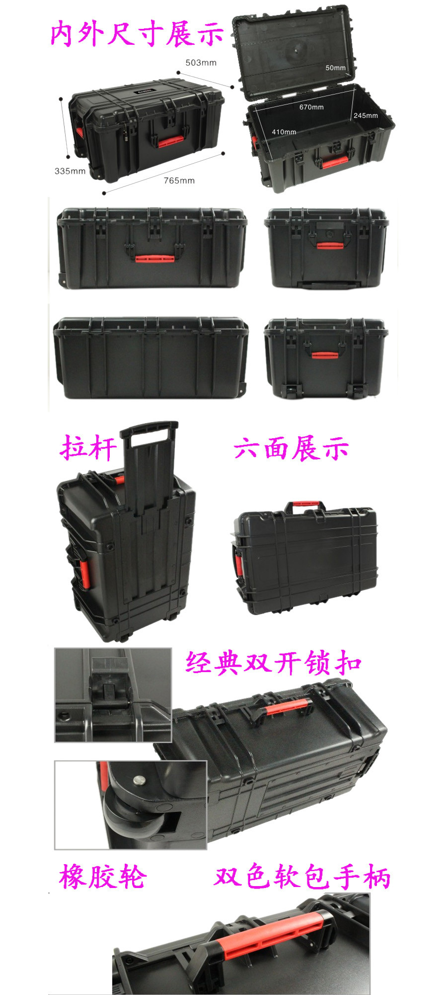 簡要說明:廣泛用于傳媒、公安、消防、軍隊、航空、戶外攝影、野外考察、科學探測等眾多領域的高端儀器、儀表。具有高強度、高抗壓沖擊、防潮、絕對密封、防塵、防水等特點。產(chǎn)品材質(zhì):ABS原料,箱體采用高抗沖擊的高分子聚合材料一體注塑成型,密封采用扁型彈性發(fā)泡密封橡膠條,確保防水氣密,所有較軸均采用不銹鋼材質(zhì)。